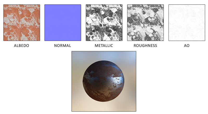 以下は、PBRレンダラーに提供された場合の視覚的な出力とともに、PBRパイプラインで頻繁に見つかるテクスチャのリストです。