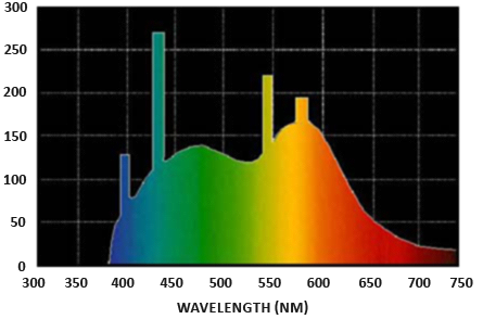 放射束:放射束Φワットで測定された光源の透過エネルギーです。光は、複数の異なる波長にわたるエネルギーの総和であり、各波長は特定の(可視)色に関連付けられています。したがって、光源の放出エネルギーは、そのすべての異なる波長の関数として考えることができます。390nmから700nm(ナノメートル)の間の波長は、可視光スペクトルの一部、つまり人間の目で認識できる波長と見なされます。以下は、昼光の波長ごとのさまざまなエネルギーの画像です。